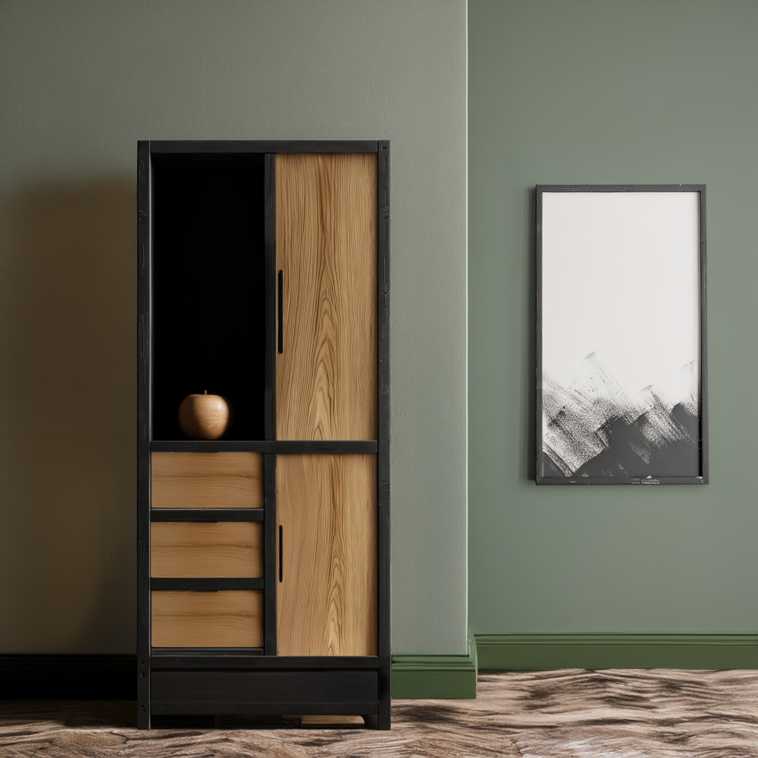 Versatile Aesthetic: The combination of natural wood and matte black finish creates a versatile aesthetic that complements various interior styles. Whether your décor is contemporary, rustic, or eclectic, this cabinet seamlessly integrates into your space.